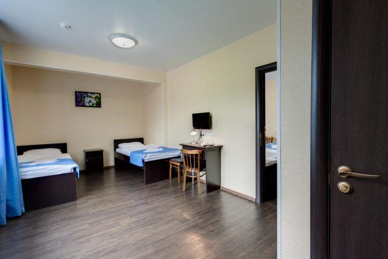 Полулюкс 2-местный:Кол-во основных мест: 2.Кол-во доп. мест: 2.Мебель: двуспальная кровать, кресло-кровать, шкаф, стол.Оборудование: телевизор, холодильник, электрочайник.Санузел: с душем.